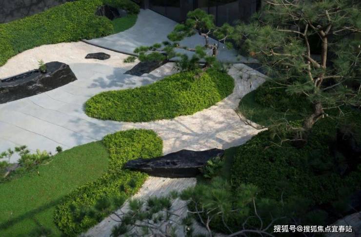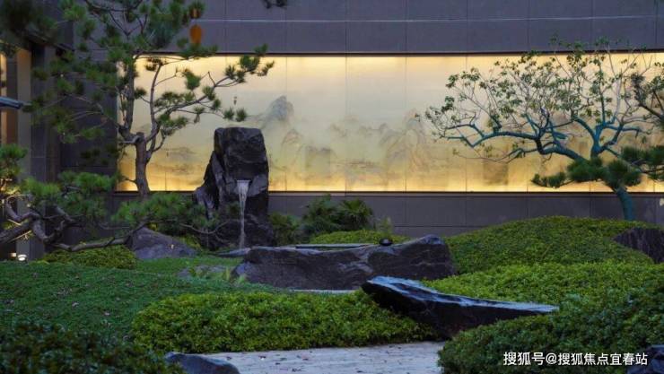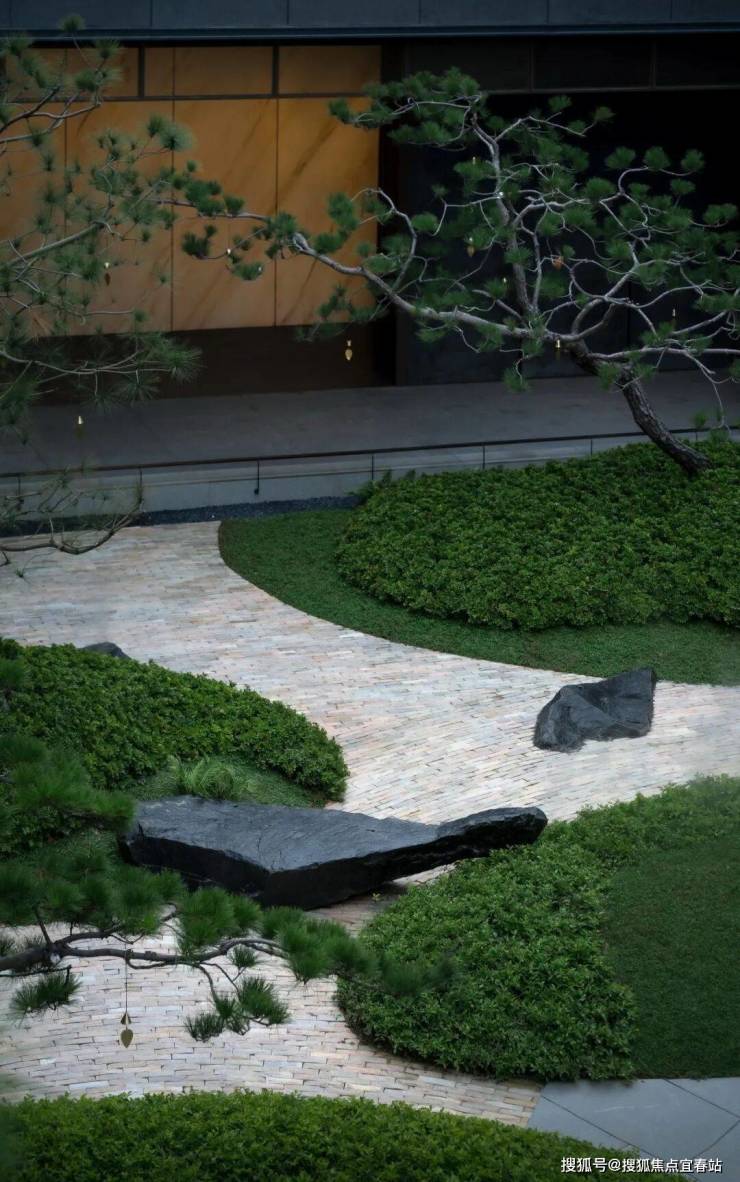 磐石之上,松月影间。造型松姿态优美,与山石相搭成景,整体水平方向探出,曲折向上向下的动势。“奇石”似为恭迎居者归来,巨石造型,稳如磐石,松石相应,感受尊崇礼遇,彰显悦字系的品质标签。