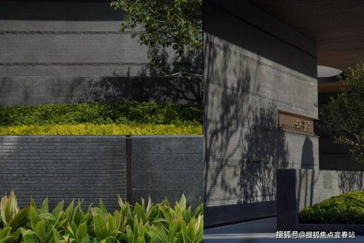 入口门楼两端设置典雅对称的景墙,中部采用静谧的镜面水景,点缀松石景观。松,旁逸斜出;石,横卧坡间。松影石艺,对景相迎。