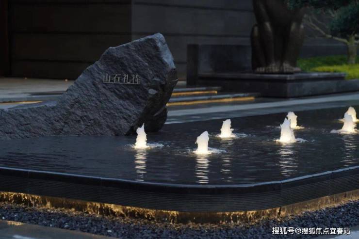 “锦绣游龙水景流转,清波荡漾情境间”, 中间的水景一端微微翘起,造型宛如龙舟浮于水面。臻选斜飘铁冬青与特选定制帝王黑景石搭配,以迎宾姿态竖立在宅院。方寸庭院间,可窥见万千气象。