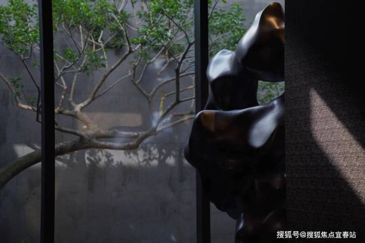 “高山流水遇知音,水到渠成自相逢”,此处庭院精心挑选多块帝王黑石头,置石摆放讲究,孤置、特置、对置、散置、群置,搭配植物形成山林景象,亦可成为天然桌椅,与人互动成趣。其中焦点位置的特选石“高山流水”和“抚琴石”,营造高山流水,抚琴如心,自在怡情的东方美学意境。