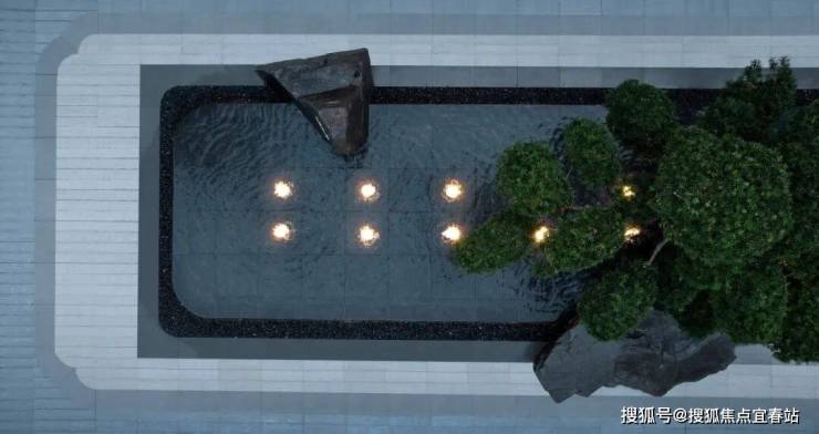 池底图案运用细长条灰白色系文化石,一块一块精心排布,铺贴肌理模拟了自然水流走势,蜿蜒曲折,与绿岛交错组合。