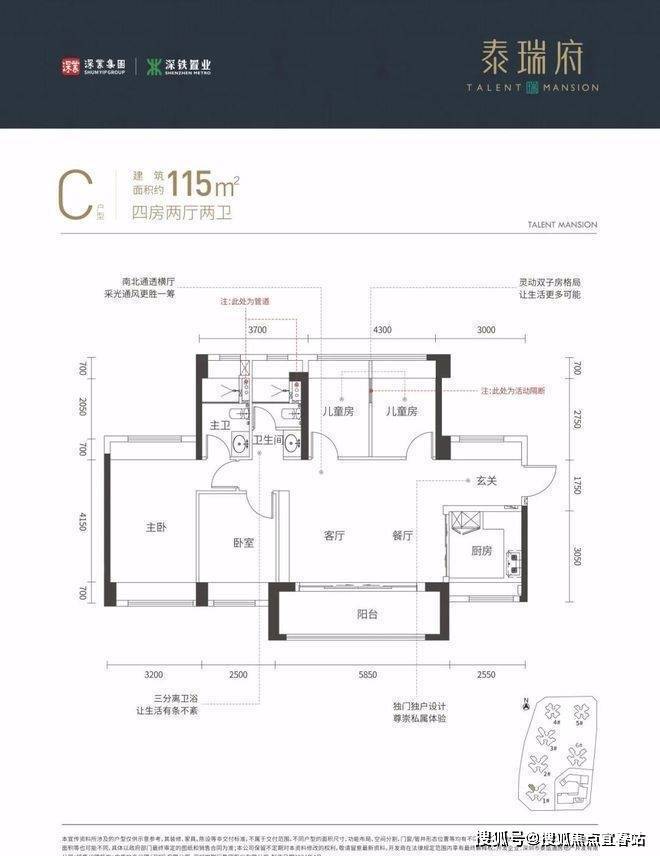 115㎡的4房2厅2卫,设计的是横厅南北通透格局,进门入户玄关,客餐厅5.85米开间,四开间朝南,4个卧室分别做的3.2米/2.5米/2.15米/2.15米的宽度,主卧南北通透设计,U型厨房,公卫三段式分离,得房率:77.48%(不含赠送),阳台主朝西南或东南向。