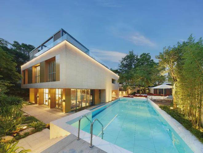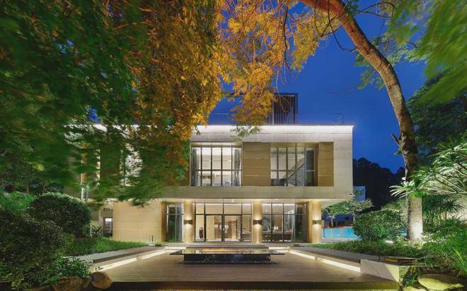S22「叠翠阁」由全球顶级设计事务所美国NBBJ操刀设计,总建面约为951㎡,相比以往的大面积独栋,S22「叠翠阁」位置更佳,一脉连着白云山,一面连着天鹅湖。首层的庭院打造了泳池区、品茗区、观湖区和自然博览区四大主题区域,景观设计独具匠心,建筑和自然和谐共生。