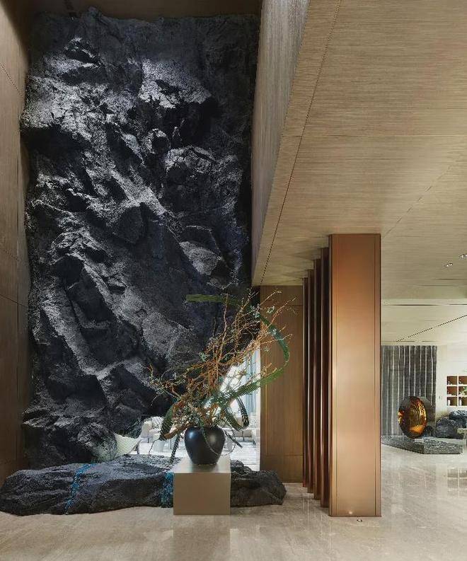 色彩的应用十分讲究,采用了高级灰+琥珀金,神秘大方,柔和华贵;配饰的应用,用心至极,摆放时无比苛刻,力求打造最佳展示效果;玄关处放置了一块黑曜石,黑曜石低调神秘的特质衬托出空间的奢华感;花艺装置更是采用了亚洲顶级花艺大师凌宗涌的作品;客厅的沙发原型则由法拉利首席设计师合作设计既酷炫又有科技感。