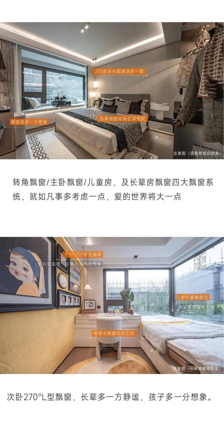 做到了三开间朝南+南向双卧,朝南两卧均带飘窗,北露台带270度L型飘窗,厨房也带飘窗!延伸了使用面积,室内采光、通透性都非常不错。