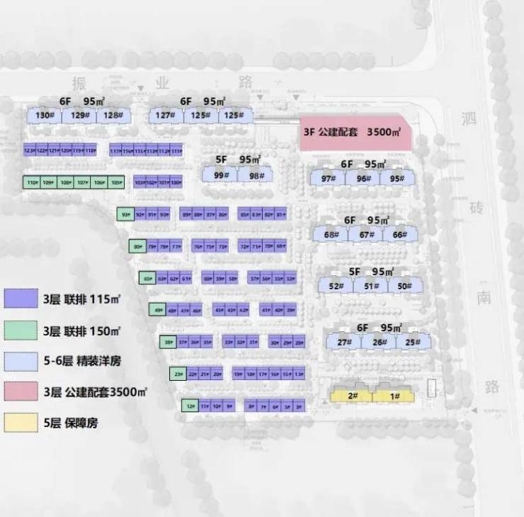 产品类型洋房总户数230套总占地面积约34042.3㎡总建筑面积约37446.53 ㎡容积率1.1绿地率约35%物业类型70年产权住宅梯户比一梯两户层高6层交付标准部分精装、部分毛坯得房率79%开发商上海中建大椿房地产开发有限公司层高2.95米物业费4.85元/平/月物业公司绿城物业拿地时间2022年9月交房时间2025年4月在售套数182套洋房在售房源96㎡洋房 三房两厅两卫(精装、部分毛坯)81㎡ 2房2厅2卫(3套1楼毛坯)楼栋分布图