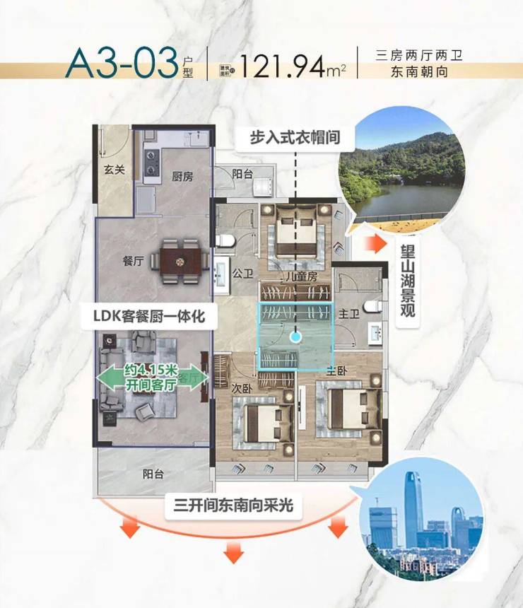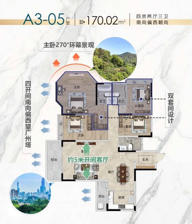 又比如A3栋建面约170㎡四房空间 ,不仅格局方正、南北通透,还做到了四开间朝南,把利用率最高的主次卧以及客厅都搬来了南面,可以随时享受“日光浴”。