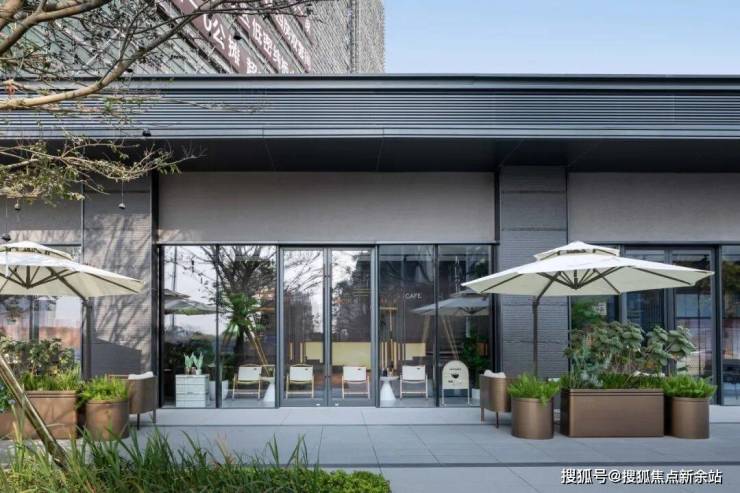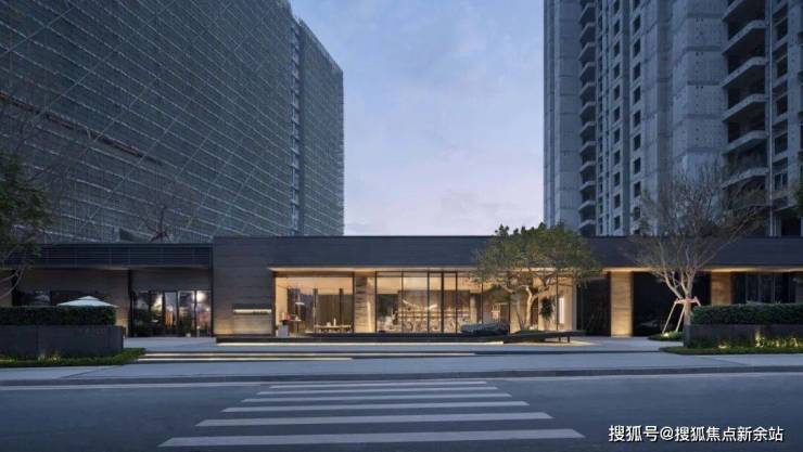 项目售楼处临街而立,宽敞开朗。售楼处前场结合未来商业属性打造开放式体验空间。设计采用体块穿插的手法将售楼处与沿街商业区别而统一,通过采用横向拉槽石材与超长金属雨棚,强化横向的线条让立面更加舒展。