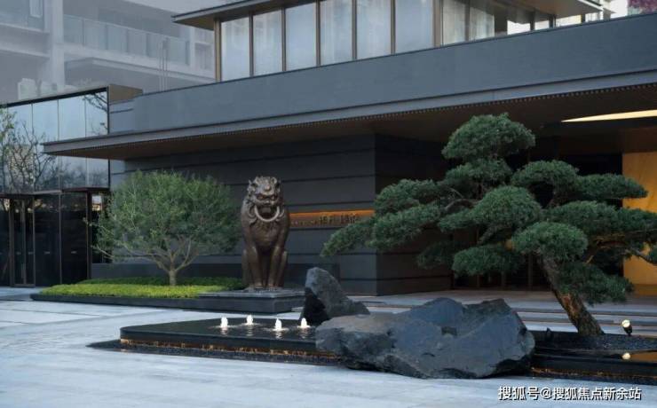 以横向线条统领整个入口大门的建筑设计,深灰色的石材结合大气出挑的金属雨棚,设计语言一以贯之,层层递进,展现出中式的奢华内敛。