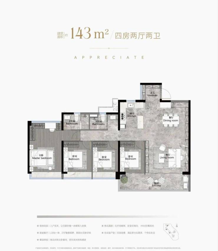 建面143平四房两卫,独立入户玄关,南向五开间朝南,南向面宽长约17米,四个房间全部为南向,可打通一个次卧做成大方厅,主卧配置L型超大衣帽间,主卧同样南北对流。总价700-770万左右。