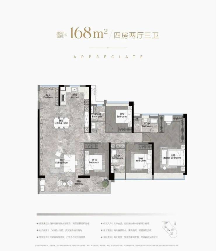 建面168平四房三卫,放大版的142平,做了双主套,适合三代同堂家庭,单边位,南北对流采光通风都非常好,约40平的大房厅,景观阳台开间约8.2米。总价830-900万左右。