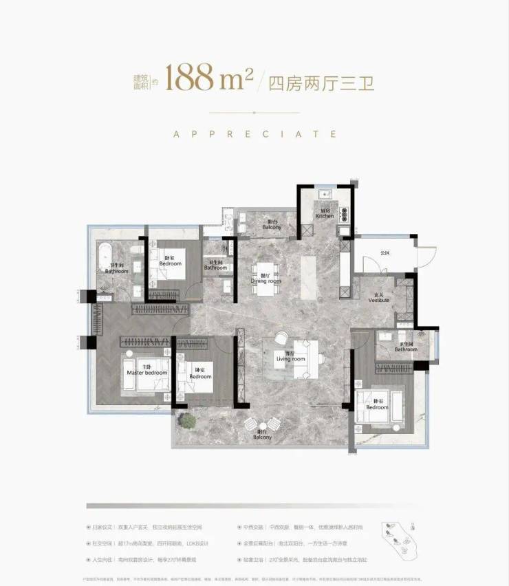建面188平四房三卫,据说使用率超110%,双主套分居两侧,三代同堂的话,可以很好地避免两代人不同的休息时间干扰互相,入户独立玄关为还有宽裕的储蓄空间,能安置酒柜等,更有南北对流双阳台+中西双厨,主卧超宽三面采光等,不愧是终极改善不二之选,9米长跑道阳台,约34平豪华主卧,270度环幕飘窗。总价970-1100万左右。