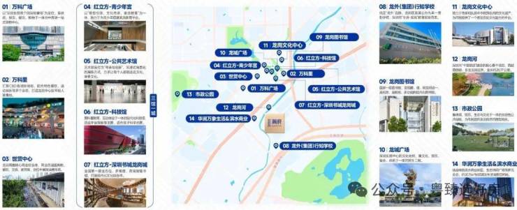 1公里内聚合行政集群(20+政务机构)、商务高地(万科/珠江等超百万方写字楼)、文化地标(25万㎡三馆一城)及七大商圈(万科广场、宝能all city等)