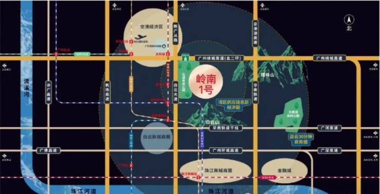岭南1号位于六片山,在广州新中轴的北端,既享有城市的繁华,又根植于美好的自然生态。距离地铁十四号线东平站1.6公里,靠近北二环高速公路、新广从公路、北太路、106国道等高快速路和主干道,距离白云新城仅约5公里,距离天河仅约10公里,恰好契合了当代精英阶层"既要便捷又要静谧"的生活追求。