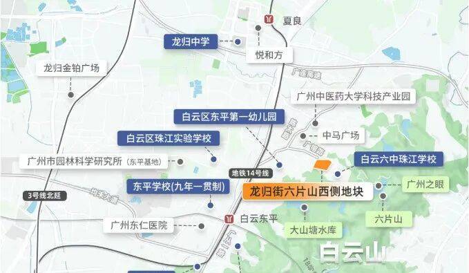 东侧为白云六中珠江学校(高中),南侧为广东实验中学,还有龙归中学、东平学校、永兴小学。其中东平学校(小学),与省实关系很好,未来有望纳入省实教育集团统一管理。地块西边规划一所36班九年制学校,远期还可以扩建为45班制。