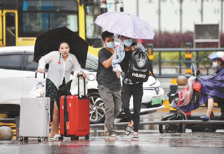 10月8日,在海南省海口市,市民和游客在雨中前行。记者从海南省气象局获悉,今年第17号台风“狮子山”已于8日22时50分左右登陆海南省琼海市潭门镇沿海,登陆时强度为热带风暴级(20米/秒)。“狮子山”将联合冷空气,给广东、海南及广西等地带来强风劲雨。