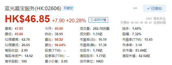 2月26日,碧桂园服务(06098.HK)、蓝光嘉宝服务(02606.HK)复牌首日,股价走势呈两极分化。截至发稿,碧桂园服务报62.55港元/股,下跌6.64%,总市值1840.58亿港元;蓝光嘉宝服务报46.85港元/股,涨20.28%,总市值82.92亿港元。