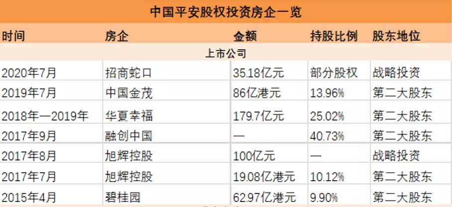 资料显示,从2015年开始,平安就陆续参与地产股权投资,已成为碧桂园、旭辉、华夏幸福、金茂、融创中国的第二大股东。