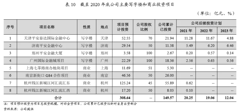 截至2020年底,平安不动产的主要写字楼和商业投资项目共8个,分布在天津、济南、郑州、广州、上海、南京及杭州,项目预计投资总额为308.74亿元,公司累计已投资149.57亿元。