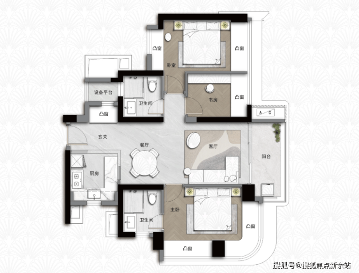123/126㎡四房两厅两卫:南北通透,约 4.2 米宽厅,LDKB 一体化设计;四开间朝南,六大凸窗 + 设备平台;主卧套房带独立卫浴与 270° 飘窗,适合三代同堂的改善家庭。