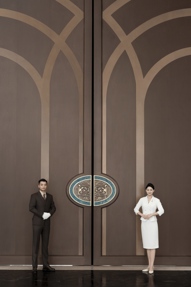 二进院“水境回廊”,将令人惊叹的“文化浓度”融于空间。六扇瑞兽纹墙以岭南剪纸工艺呈现,象征“六合天地”;两吨重约7.5米高鎏金铜门,由非遗大师朱炳仁锻造。