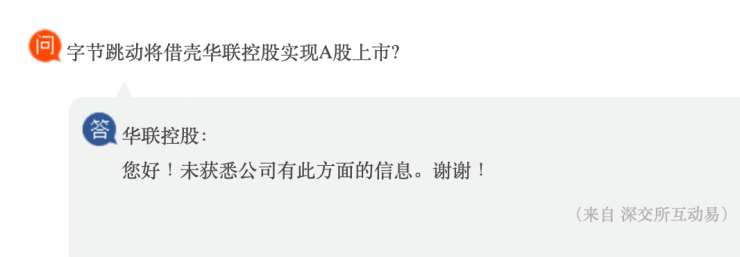 字节跳动要借壳华联控股实现A股上市?4月底就在华联控股发布财报前,这一传闻流出,华联控股予以了否认,称“未获悉公司有此方面的信息”。