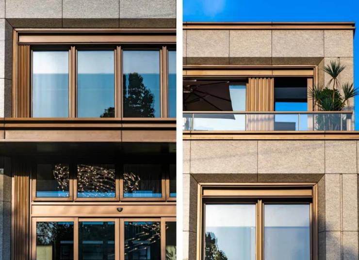 立面采用现代都会风格,用进口花岗岩石材、香槟金铝板配上深色门窗,使建筑整体更加现代、高档和耐用。