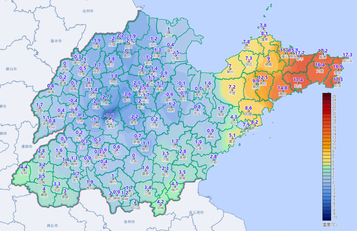 昨天夜间开始气温快速下降,7日16时我省中西部地区气温在-2~0℃左右,半岛地区在6~18℃。