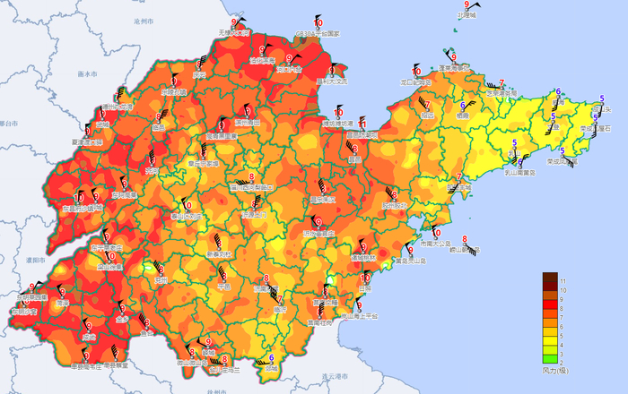 昨天夜间开始我省出现偏北大风。渤海和渤海海峡出现10~11级大风,潍坊昌邑防潮坝站较大为11级(30.3米/秒);鲁西北、鲁中、鲁南和半岛西部地区出现了8~9级大风。