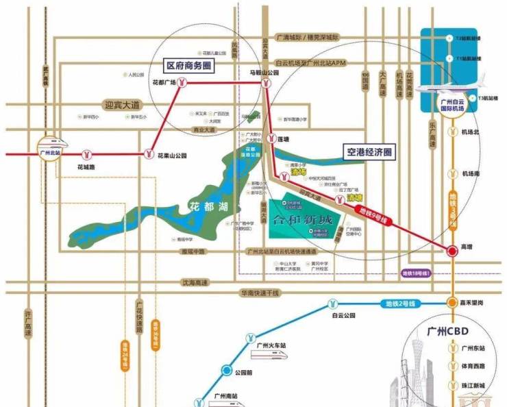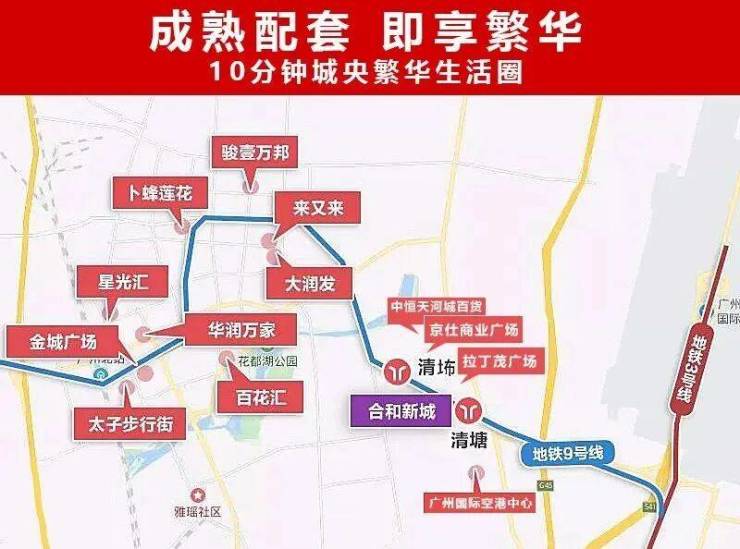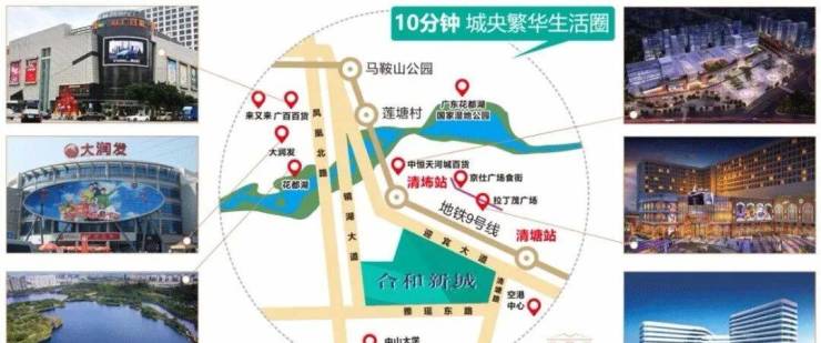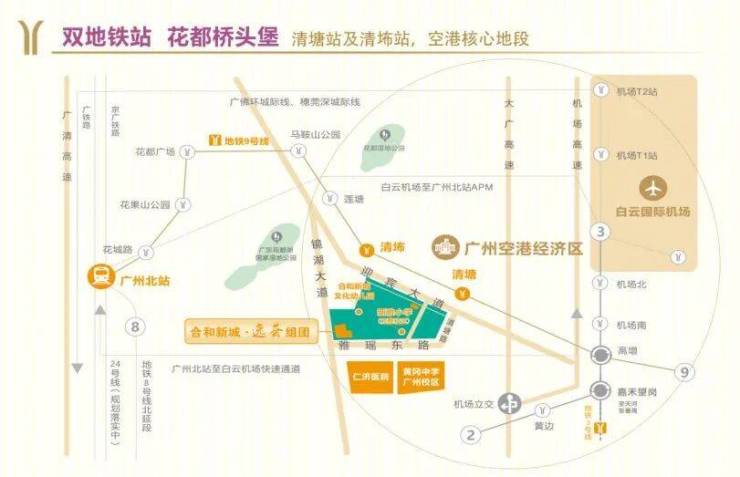合和新城位处花都区迎宾大道3号,为花都出入市区必经之路,立足于花都空港经济核心区域,广州地铁九号线清塘站、清㘵站双站口旁,交通优势尽显,无可取代的黄金地段。项目周边路网环伺,搭乘地铁2站可到达白云国际机场,约40分钟通达全城,尽享都市繁华生活圈。