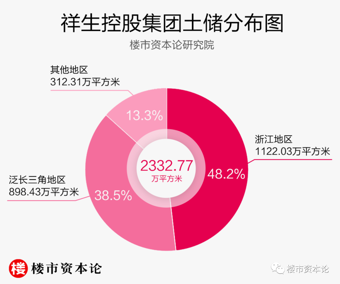 公告显示,截至2020年12月31日祥生控股集团的总土地储备为2332.77万平方米。从区域结构上看,其土地储备主要集中在浙江和泛长三角地区,土地储备总量达1122.03万平方米和898.43万平方米,分别占总土地储备的48.2%和38.5%。