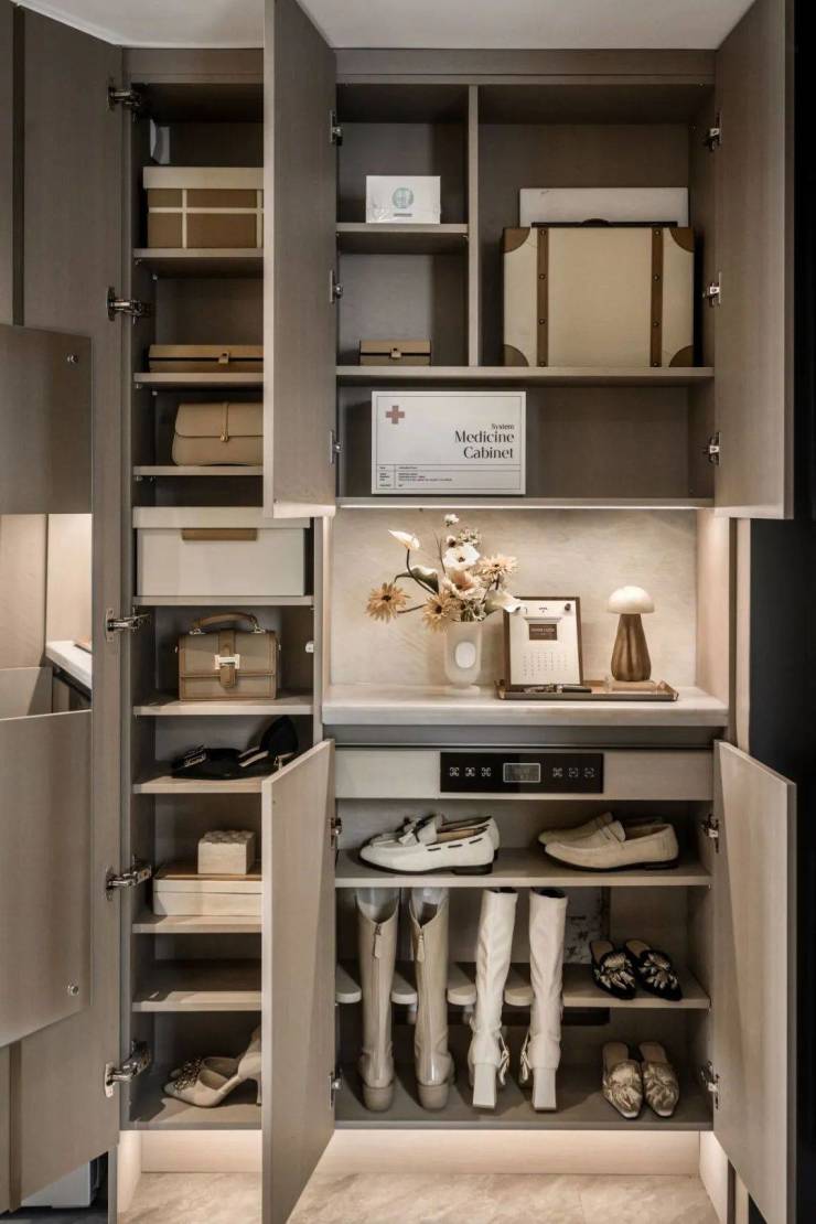玄关柜设置消毒精灵,售楼处电话:400-000-0460转6666在保持健康居家环境的同时,也让生活的情绪感满满。长靴隔板方便长靴的护理与收纳。换季鞋盒收纳区,进一步提升收纳空间。