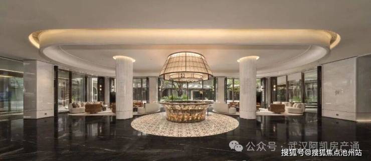 前厅为酒店式落客设计,运用大量奢石;四水归堂的黑石水景以法国进口宝格丽奢石铺就。