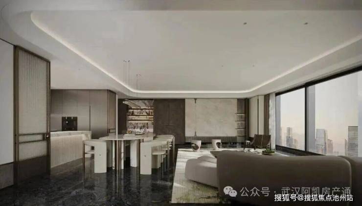 Ultra版环幕客厅,面向江景与中庭处,采用无界转角270度全景舱设计,拥有极致景观视野。