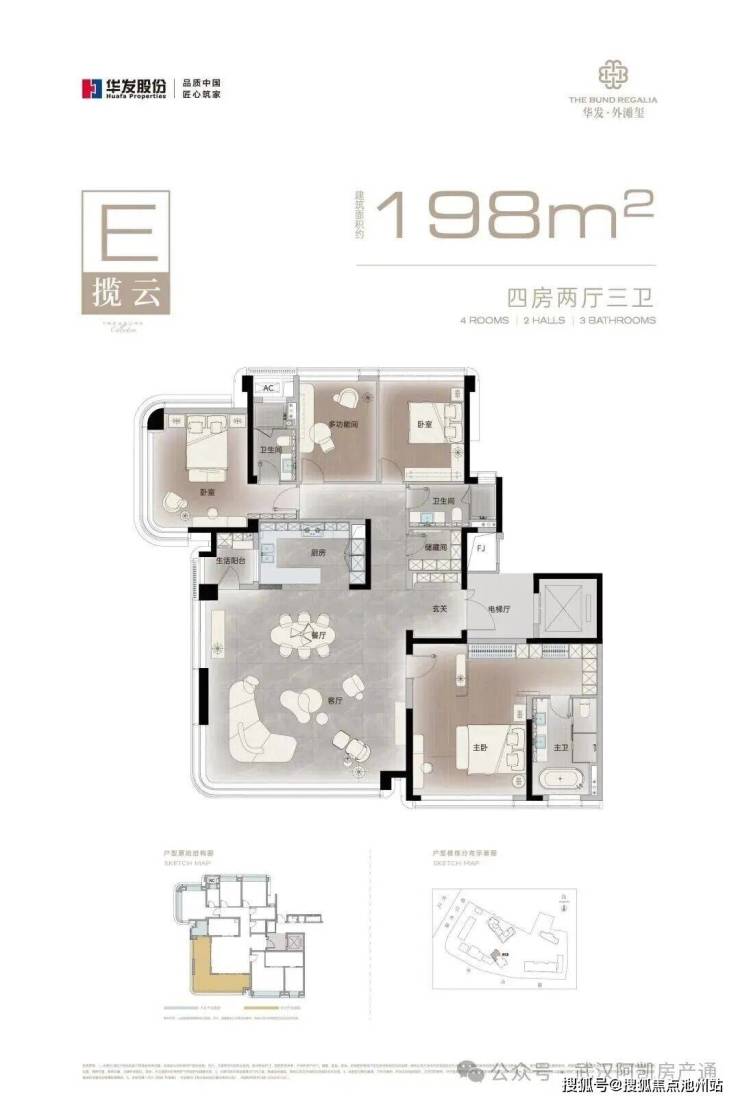 南向198㎡户型:晨观江心日出,暮赏大桥星灯。