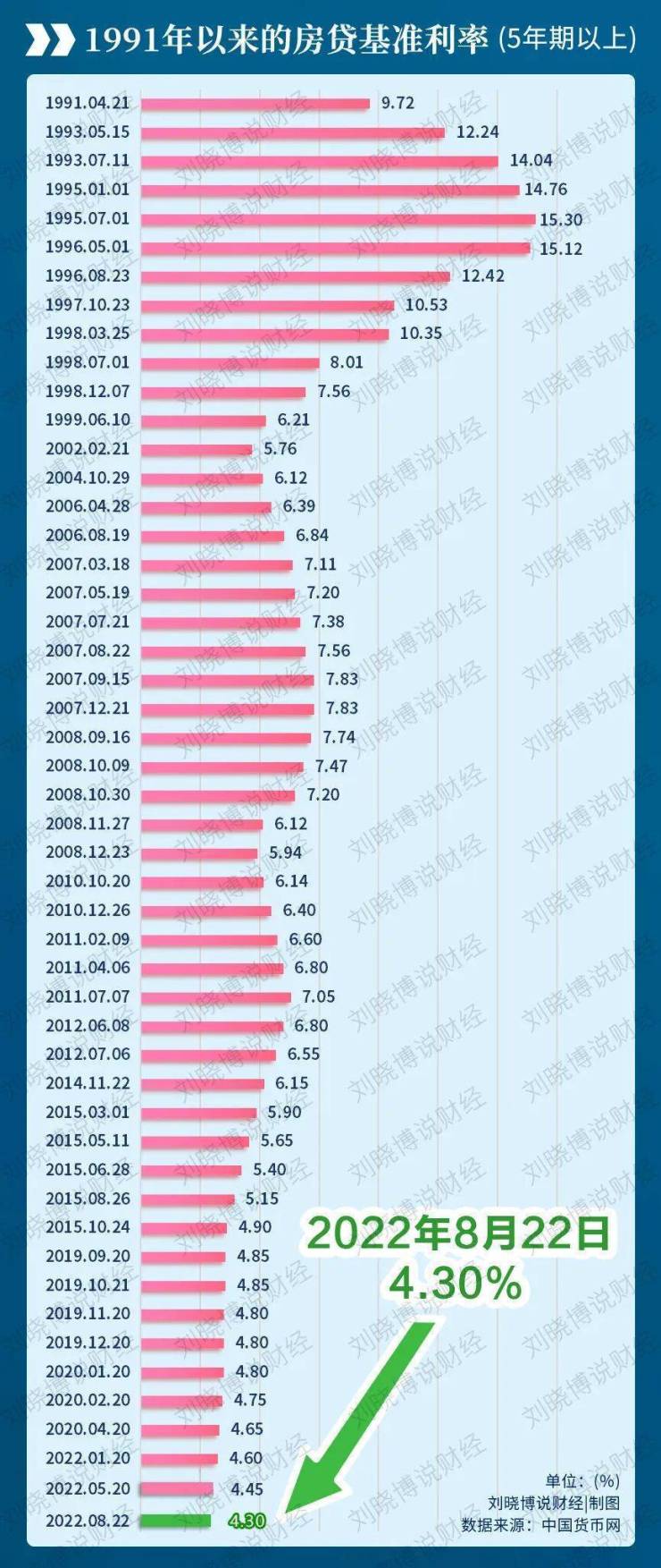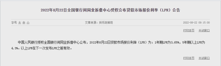8月22日,央行将一年期贷款市场报价利率(LPR)从3.70%下调至3.65%,将五年期贷款市场报价利率(LPR)从4.45%下调至4.3%。