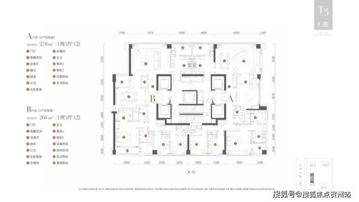 12-20F偶数层户型:533平,五房五厅六卫,南北通透