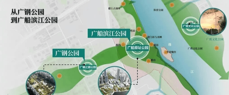 拥有约 18 万㎡广船滨江公园,配备儿童公园、大草坪、羽毛球场、篮球场等设施,并与广钢原址公园相连,形成约 60 万㎡的城市绿洲。