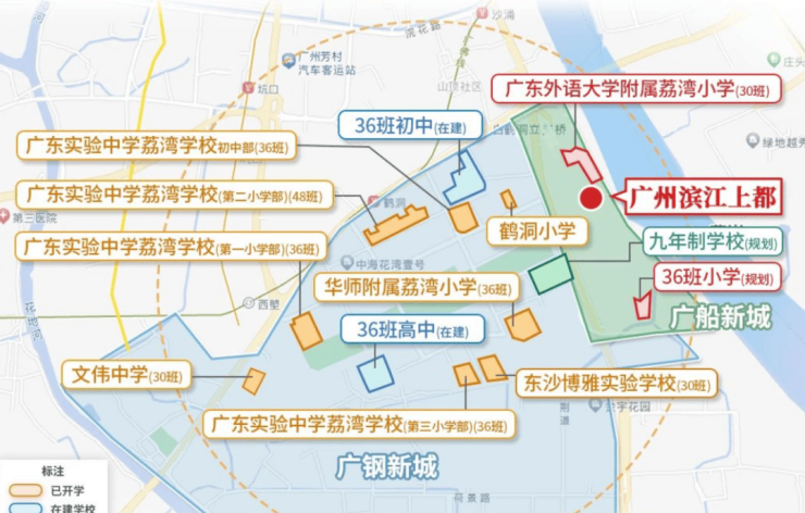 社区内自建 2 所 12 班幼儿园和 1 所 30 班小学,小学是广东外语外贸大学附属小学,一期幼儿园为荔湾区青少年宫附属幼儿园(璇湾园),二期尚滨道楼下也有配建3层高的幼儿园,形成从幼到小的完整教育闭环。