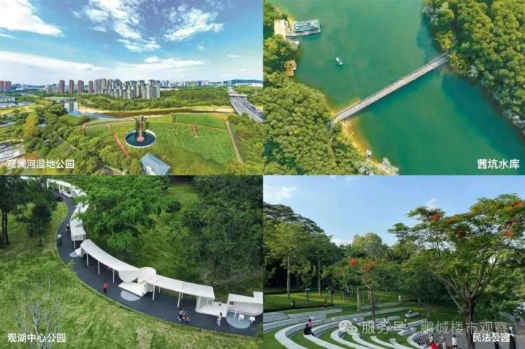 生态环境较好:周边有观澜湖生态体育公园、观澜民法公园、观澜体育公园、观澜河湿地公园、长湖公园及茜坑水库等,为居民提供了休闲健身的场所。社区内还打造了 1.9 万㎡“新 SMILE 系园林”,融入二十四节气植物系统,配备 550 米健康跑道、儿童游乐区等,满足全龄需求。