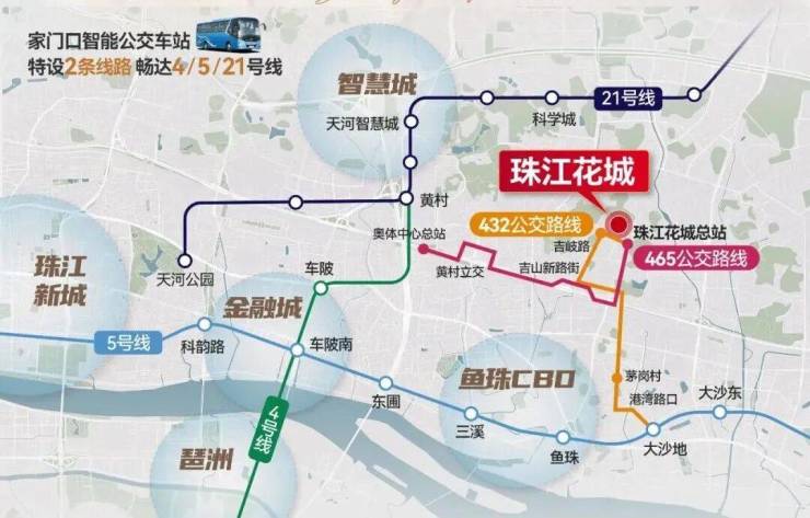 【465】路公交无缝接驳地铁4/21号线黄村站,【432】路则直达地铁5号线大沙地站,可畅达鱼珠CBD、珠金琶CBD