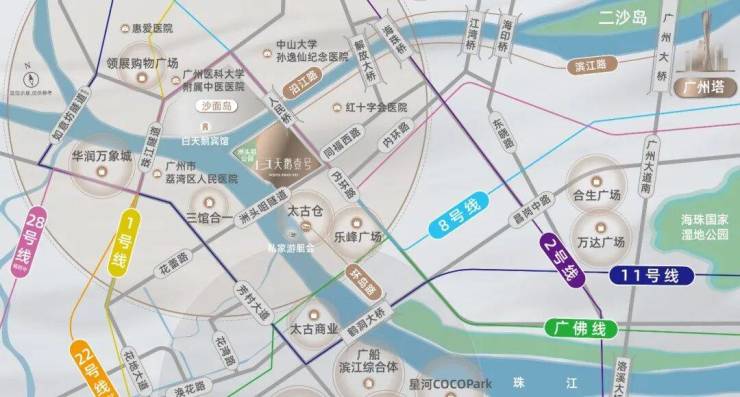 ✅ 商业配套:近享上下九商圈、江南西商圈、白鹅潭CBD商圈三大高端购物商圈,涵盖高端商场、星级酒店、特色餐饮等多元业态;周边滨江休闲带、文化场馆环绕,满足顶豪人群社交、休闲、娱乐等全场景需求[3]。