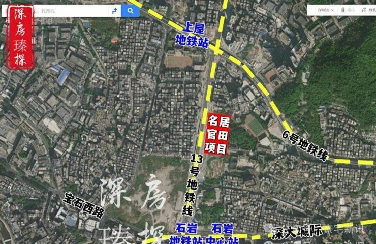 名居云山府原为官田社区土地整备利益统筹项目,位于石岩街道田心大道东侧,处于13号线石岩站和6号线和13号线双地铁交汇的上屋站之间。