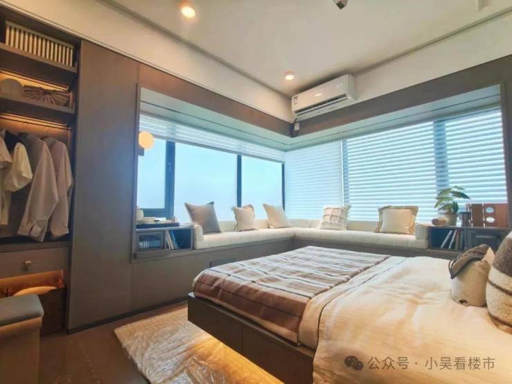 建面103平四房两卫,LDBK一体化设计,书房并入客厅,次卧还能做到床不靠窗,还有良好的动线空间,另一间北向次卧可用作二套房,主卧约280度飘窗,南北对流。