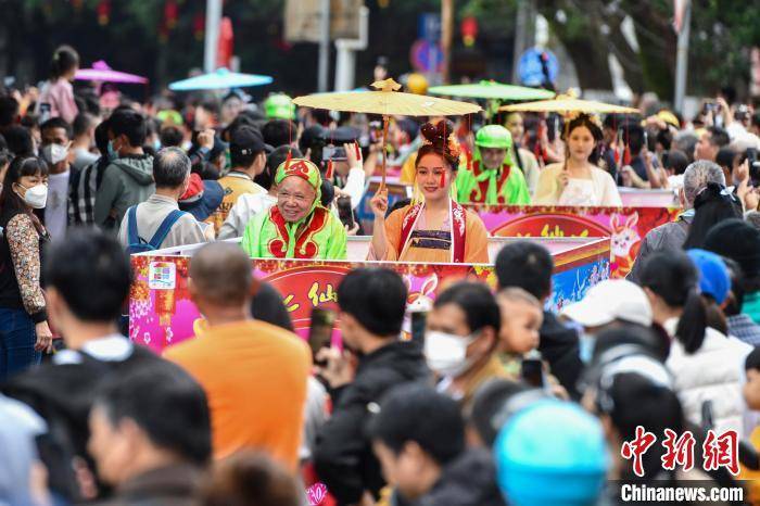 2月5日,海口市琼山区府城举行“装马匹”民俗祈福巡游。“装马匹”民俗巡游队伍,吸引民众围观。 骆云飞 摄