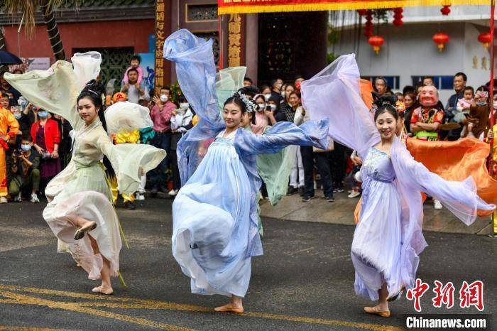 2月5日,海口市琼山区府城举行“装马匹”民俗祈福巡游。图为巡游中的舞蹈表演。 骆云飞 摄