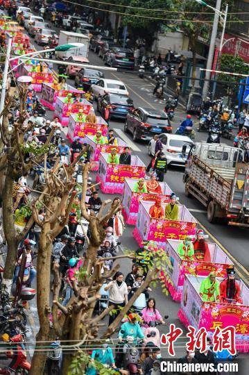 2月5日,海南省海口市琼山区府城举行“装马匹”民俗祈福巡游。图为“装马匹”民俗巡游队伍。 骆云飞 摄