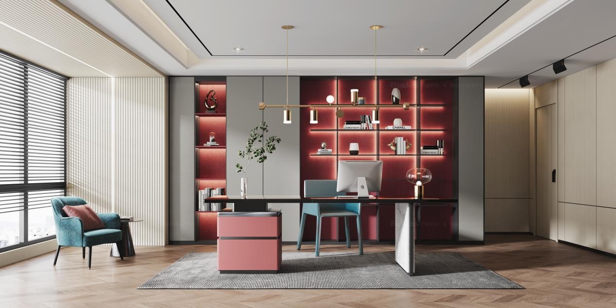书房的设计也是一绝,与客厅、餐厅相衬的嵌入式墙柜设计,在简约而不简单的风格上加入北欧风的装饰,带给人更朴素、更纯粹的视觉之美。除此之外,书桌前的绿色吊饰,也是十分惹眼。