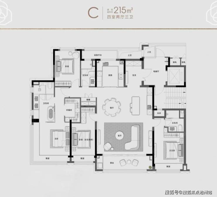 房型得房率很高,约90%,超过市面上很多同段户型。虽然只设计了四房,但其各个空间尺度都相对更大,灵活性和可变性也更充足。