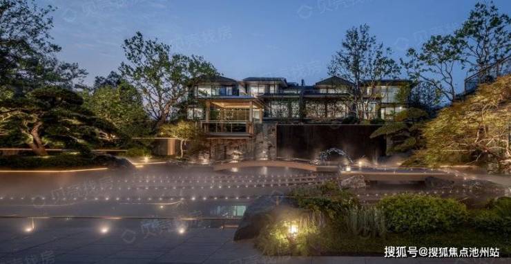 在立面打造上,提取“宋画”中的线条感,提取歇山顶样式,转译形成深远的挑檐,在视觉效果上给人以棱角分明、结构清晰之感,整体呈现一种清雅内敛的当代气质,大尺度巨幕玻璃窗镶嵌金色铝线条,如画框一般,攫住窗外的每一寸风景,让建筑隐于自然。